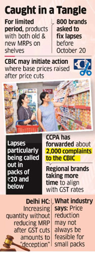 The Centre has issued notices to around 800 brands and companies, directing them to rectify discrepancies by October 20, especially in cases where firms have cited system delays or technical glitches. Industry sources said several regional FMCG brands are still aligning their billing systems to reflect revised GST rates.